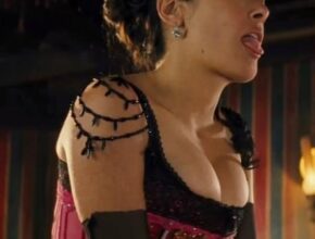 Salma Hayek, a vision in crimson and black lace, embodies a character of undeniable allure and danger. Her playfully extended tongue hints at a mischievous, perhaps even wicked, nature. The low-cut corset, a fiery red …