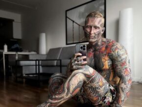 A tattooed man, a canvas of vibrant, swirling Japanese irezumi, sits on a hardwood floor, a stark contrast to the modern minimalist apartment surrounding him. His expression is serious, almost unsettling, as he holds a …