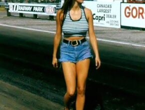 A captivating enigma unfolds on the sun-drenched asphalt. A young woman, radiating a dangerous allure, strides away from the viewer’s gaze. Her long, light brown hair dances in the summer breeze, a stark contrast to …