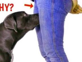A dark, imposing canine, possibly a Labrador Retriever or similar breed, is depicted in a close-up view. Its head is lowered, its attention intensely focused on a point just below the waist of a person …